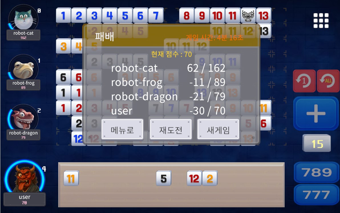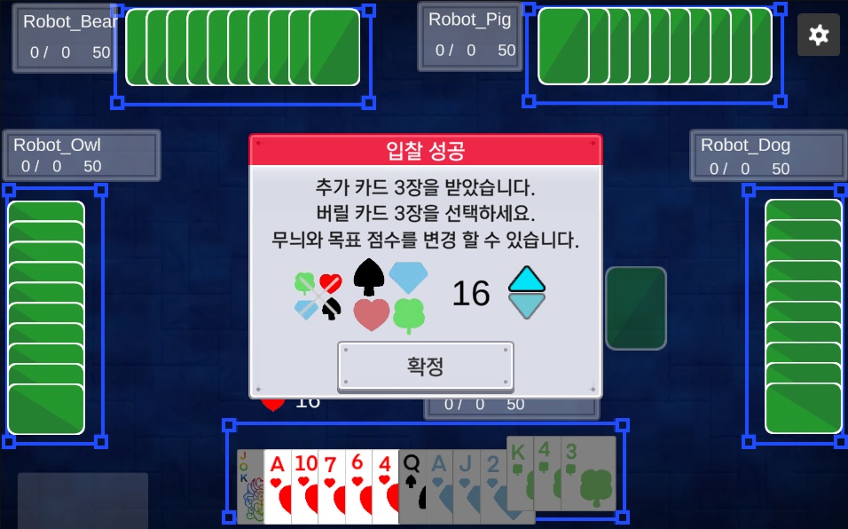 - 주공이 된 사람은 내려놓았던 3장을 가져가고 가장 필요 없다고 생각하는 3장을 비공개로 내려놓는다.